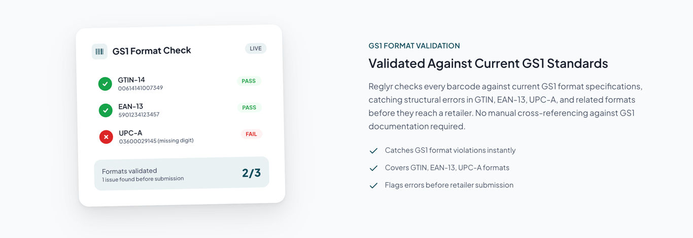 On the labeling side, Reglyr's GS1 Barcode Compliance tool validates GTIN, EAN-13, and UPC-A formats against current GS1 standards and market-specific requirements before printing. A barcode error caught at this stage takes minutes to fix. The same error caught after a pallet is already at the distribution center can cost a brand its entire seasonal launch window.