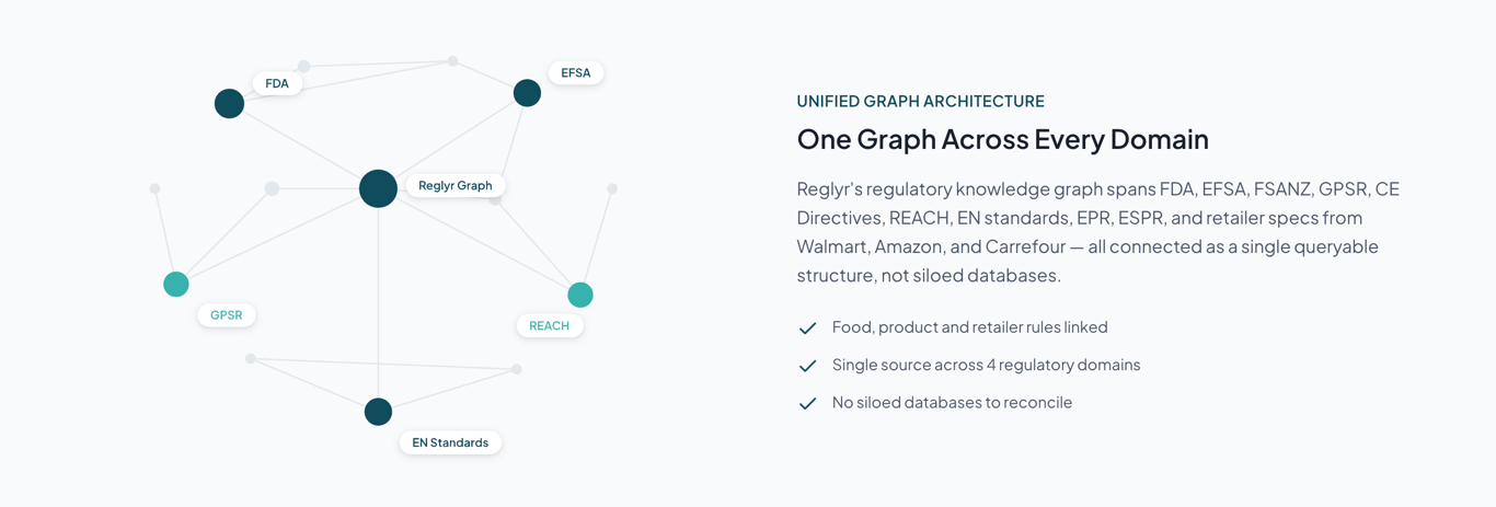 Every answer is traceable back to the original legislation, retailer specification, or regulatory guidance, giving compliance teams the defensible audit trail they need. And because the graph is continuously updated with real-world interpretations from Reglyr's in-house consultancy, the information reflects how regulations are actually being enforced — not just how they read on paper.