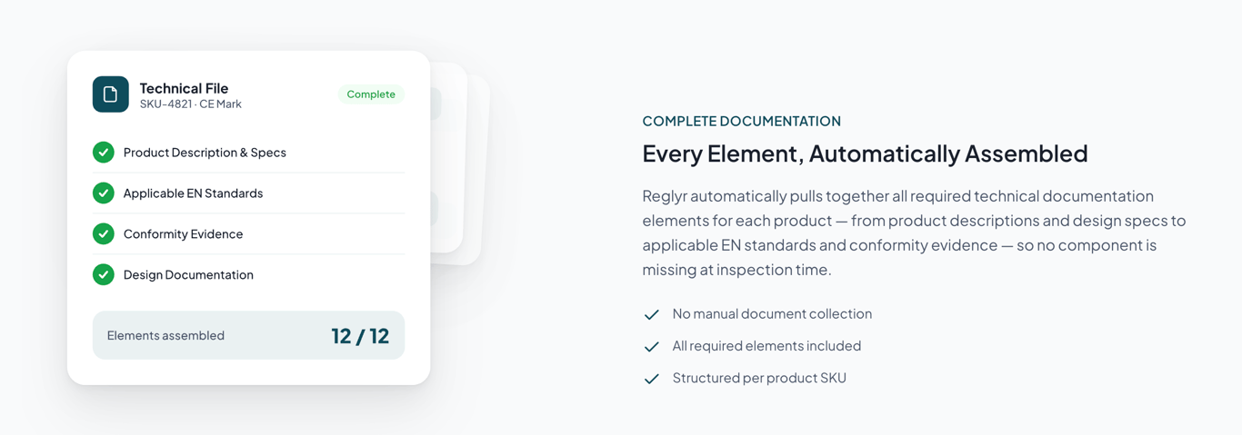 Reglyr's Automated Technical File Generation changes that equation entirely. The platform automatically assembles complete, inspection-ready technical files per SKU — pulling together all required compliance documents, formatted to the legal standards of the relevant authority. GPSR compliance, CE Directives, and similar frameworks are handled without manual intervention.