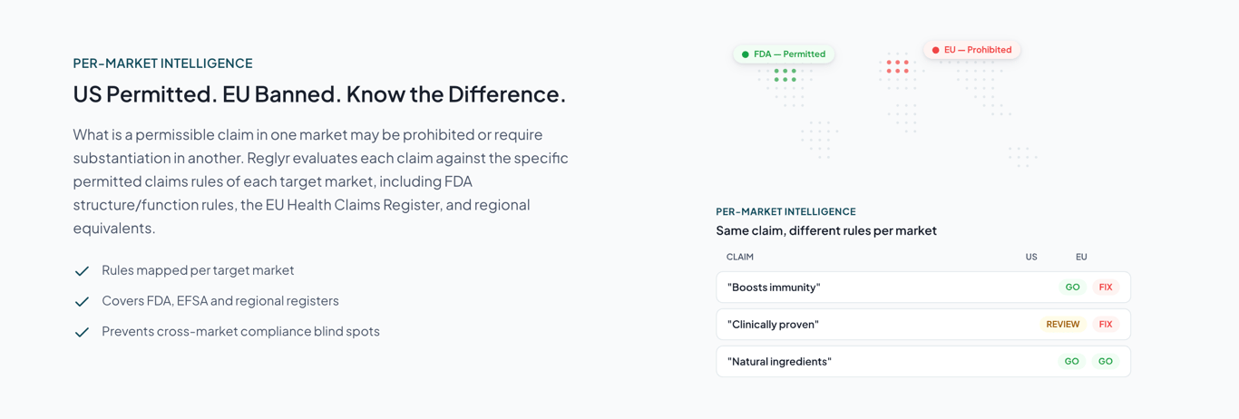 This matters more than most teams realize. A claim that's perfectly permissible in one country can be an outright violation in another. Without per-market intelligence built into the process, the risk of an expensive correction — or a forced product reformulation — is high.