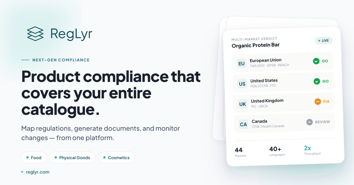 Reglyr has officially launched its multi-market, multi-domain product compliance platform, purpose-built for brands operating in food, physical goods, and cosmetics. Designed to replace fragmented spreadsheets, disconnected tools, and expensive ad-hoc consultants with a single intelligent system, Reglyr promises to turn reactive compliance fire-fighting into a confident, proactive strategy.